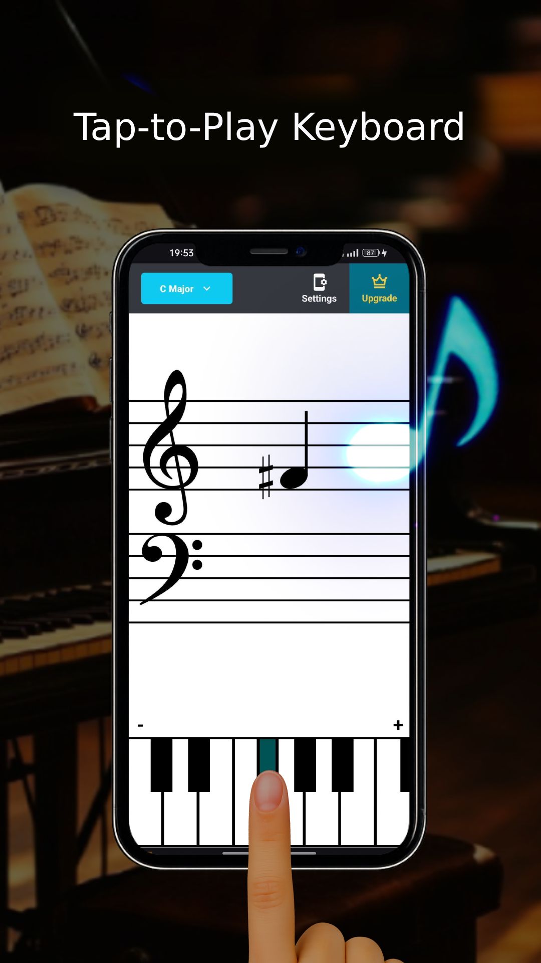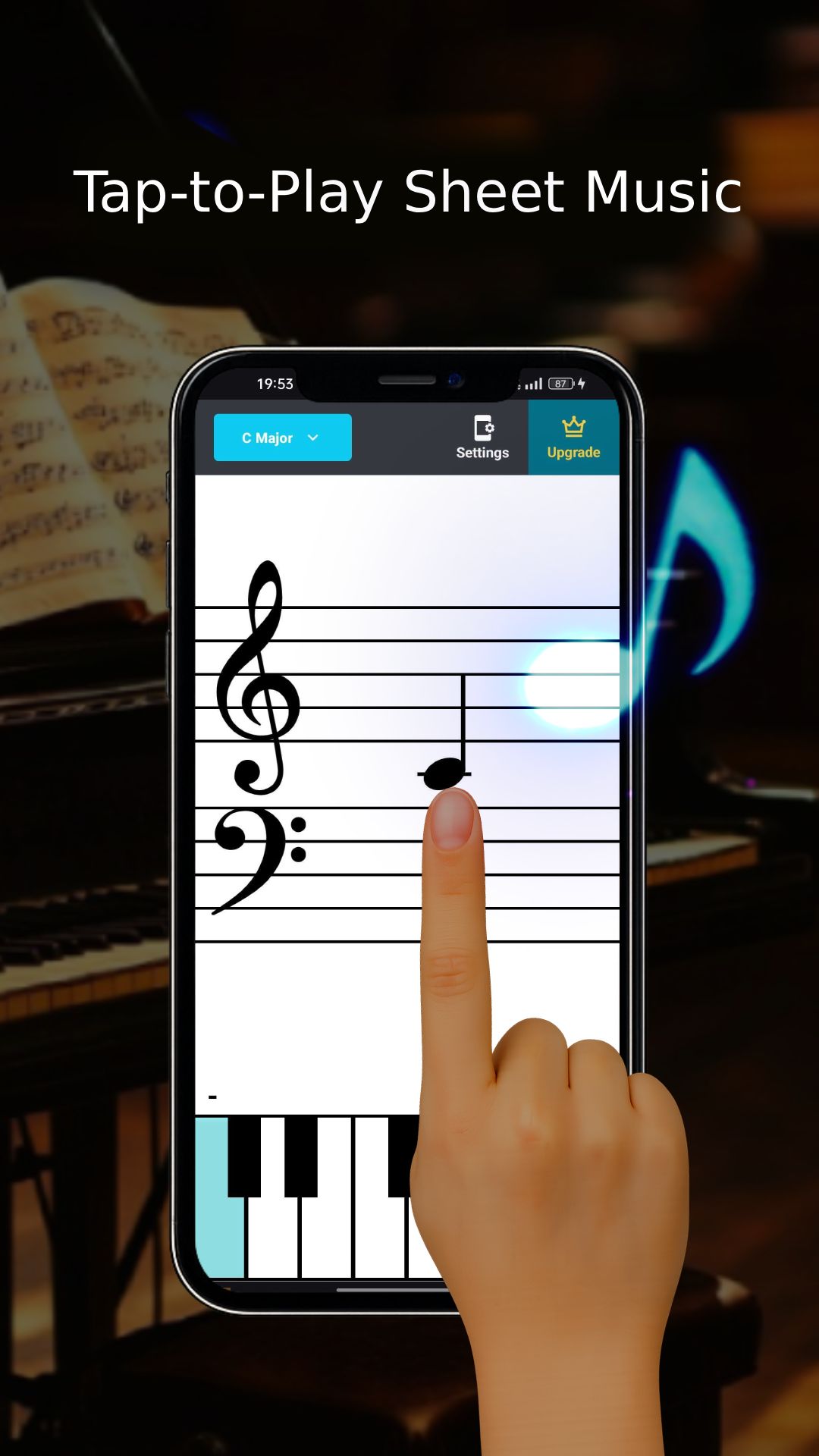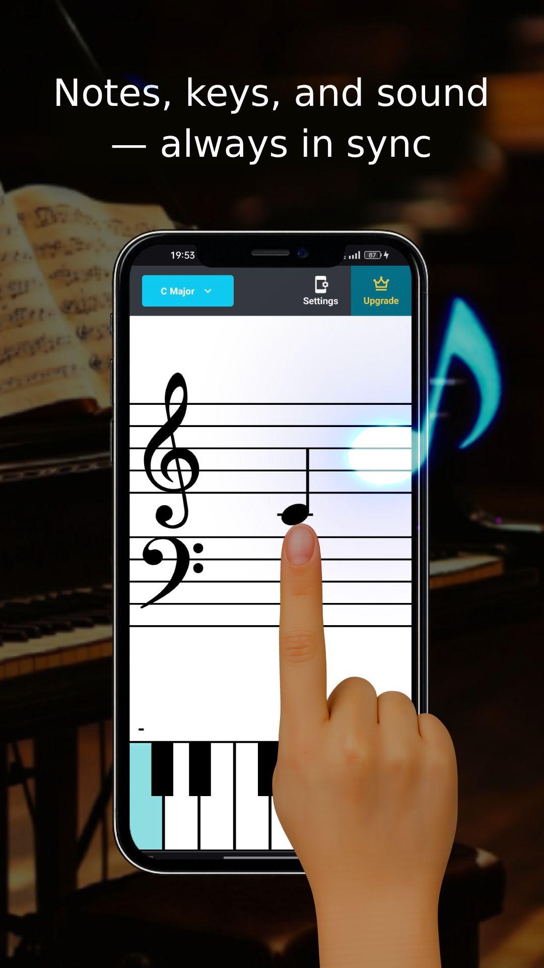 Tap the staff to see notes appear while the corresponding piano keys light up with sound. Tap the keys to see notes appear on the staff. This two-way interactive experience helps you develop musical sense intuitively.