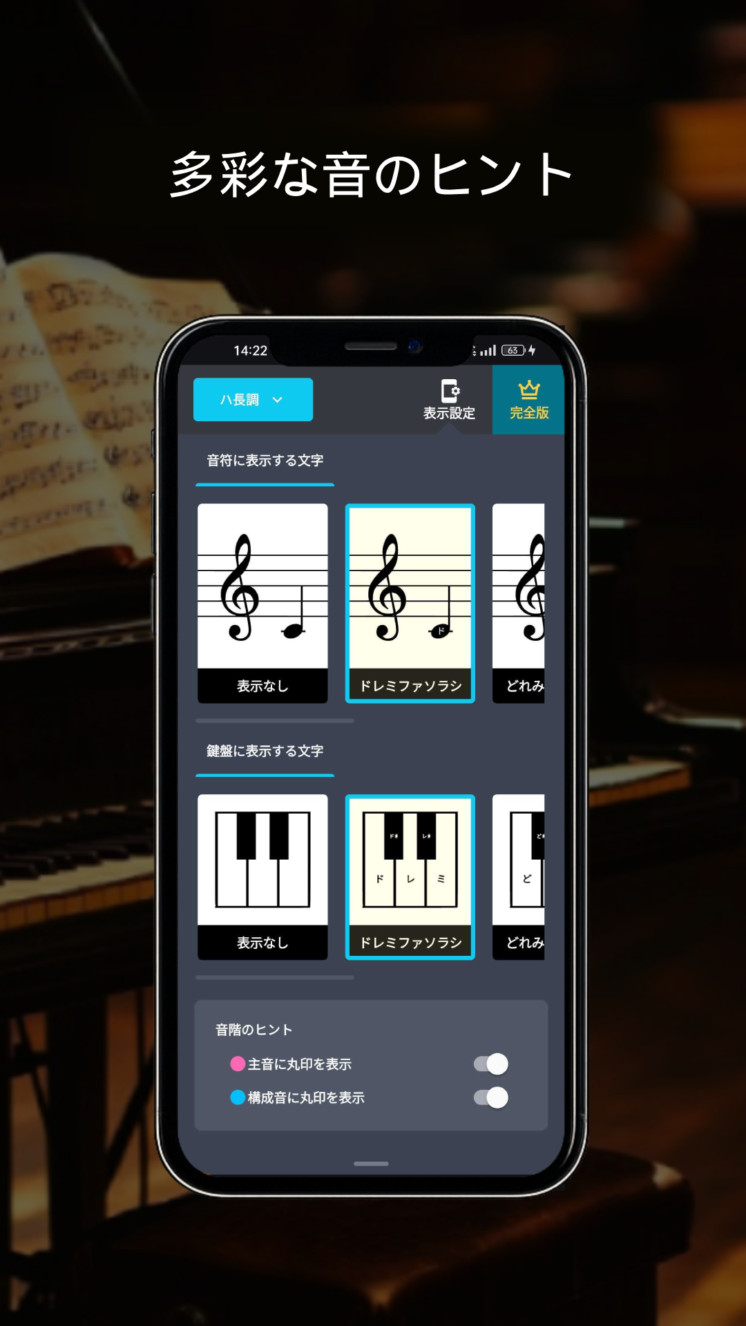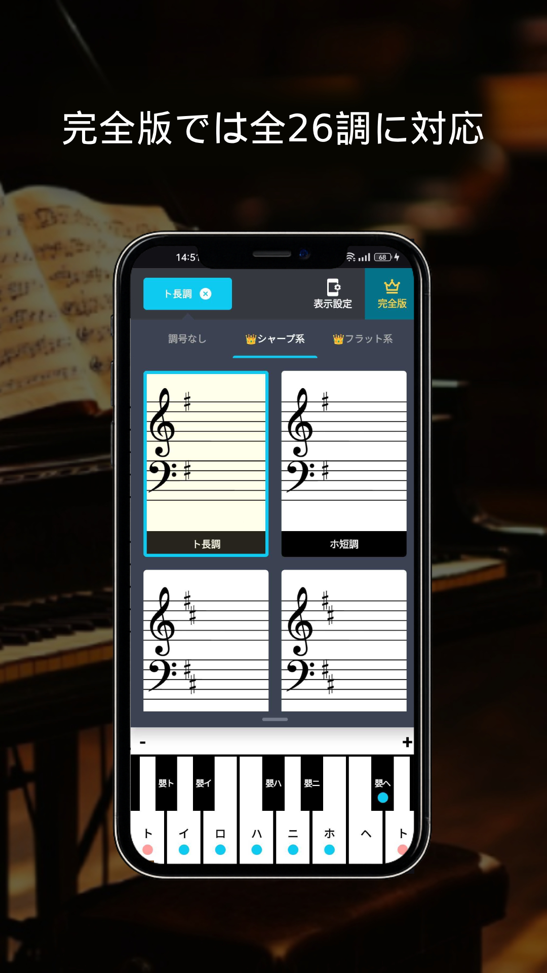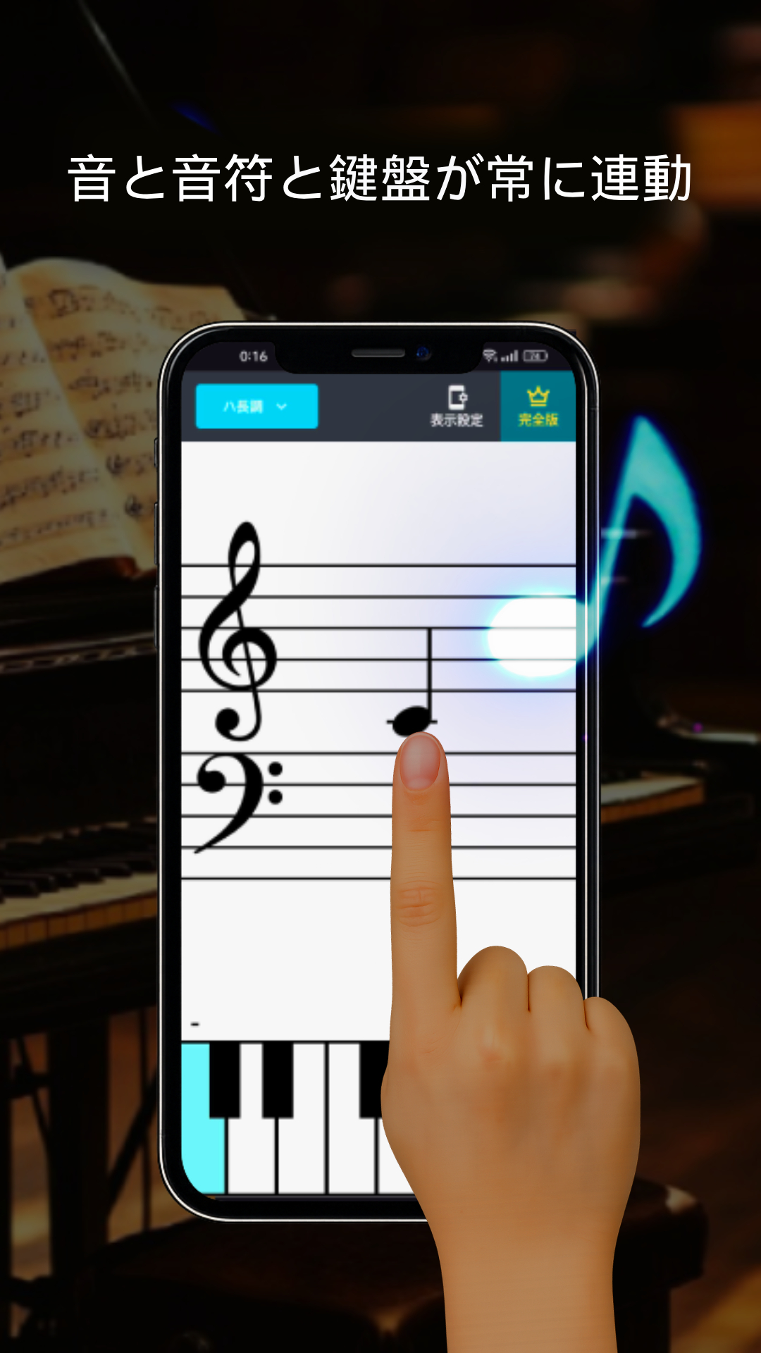 まだ言葉が出ないお子様でも楽しめるくらい、直感的なインターフェース。それでいて、全26調に対応など、難易度の高い読譜の訓練にもステップアップできます。